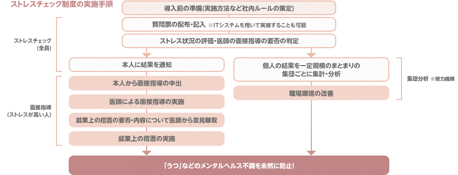 働く人が自分のストレスの状態を知ることで、ストレスをためすぎないように対処したり、ストレスが高い状態の場合は医師の面接を受けて助言をもらったり、過度なストレス要因が職場にある場合は、会社が必要な措置を検討したり、職場環境の改善につなげたりすることで、「うつ」などのメンタルヘルス不調を未然に防止するための仕組みです。