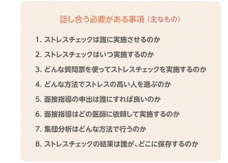 会社の衛生委員会等で、ストレスチェック制度の実施方法などを話し合いましょう。